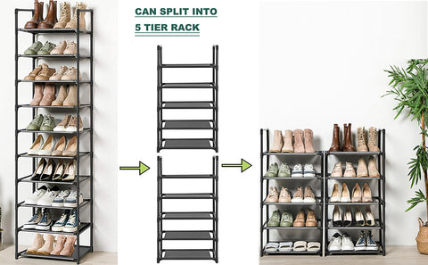 - [ Easy to assemble ] - Assemble a stackable shoe rack tall narrow or split into two shoes stand (10 tier shoe rack can split into 5 tier shoe rack 2 units). Please refer to the manual instruction in package.